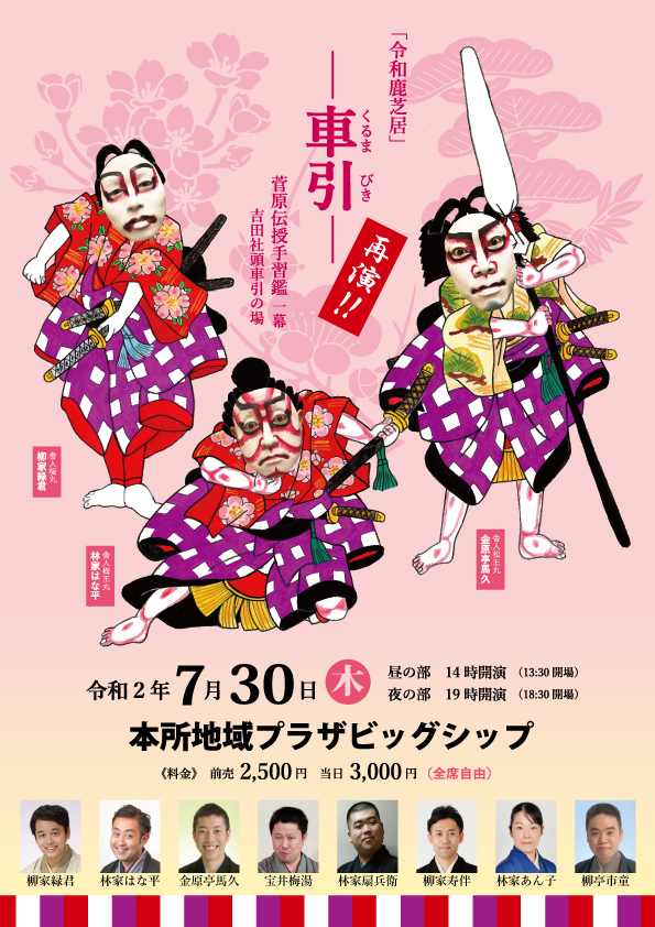 2019年クリスマスに旗揚げした令和鹿芝居。好評につき再演決定!旗揚げ公演となった第一回は歌舞伎の三大時代物の一つ「菅原伝授手習鑑」より『車引』を上演。今回さらにパワーアップして帰ってくる!鹿芝居とは噺家が芝居をする落語家による歌舞伎公演。第一部は演芸、第二部は歌舞伎、楽しい二時間をお見逃しなく!!